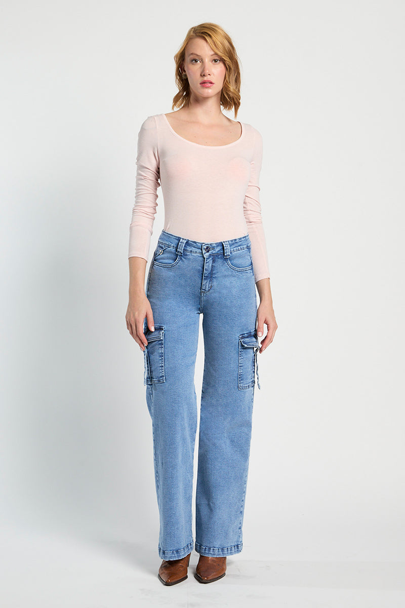 El Wide Leg Celeste Cargo con un diseño de tiro alto, dos pinzas y un botón, este jean ofrece un calce semi-ajustado y fluido que logra alargar visualmente la figura, adaptándose perfectamente a cualquier ocasión.
